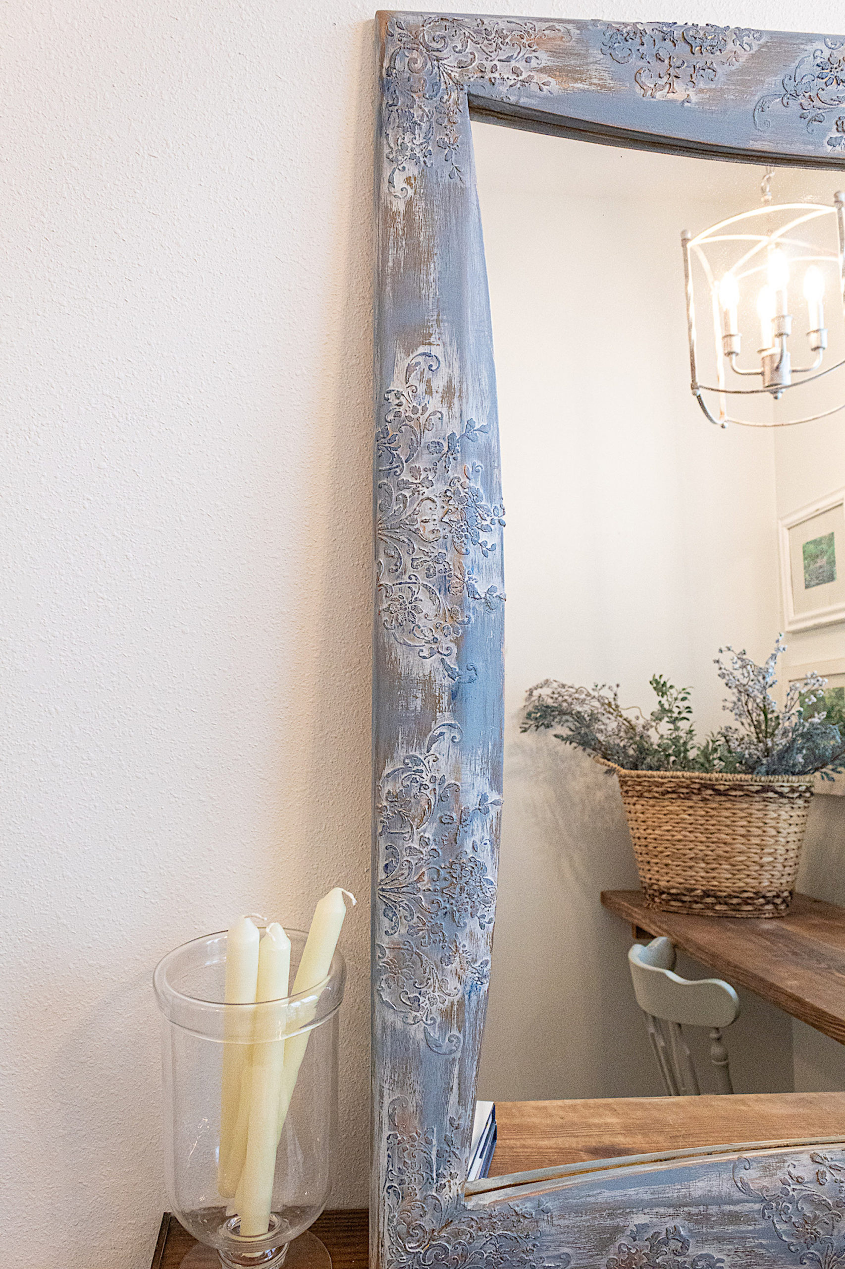 What do you think of the finished mirror? Is this not a dream! I’m totally in love with this look. It looks aged and is rich in details and texture. I’m very happy I finished the piece in the blue. I think all the colors work together magically.