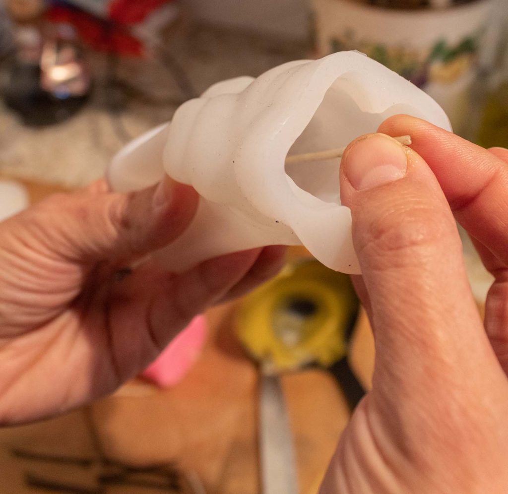 Once the hole was made, I was able to push the wick through the top of the mold. Then, using tweezers or my fingers, I pulled the wick through to the other side of the mold, making sure to leave about a 1/4 inch of wick on the top of the mold.