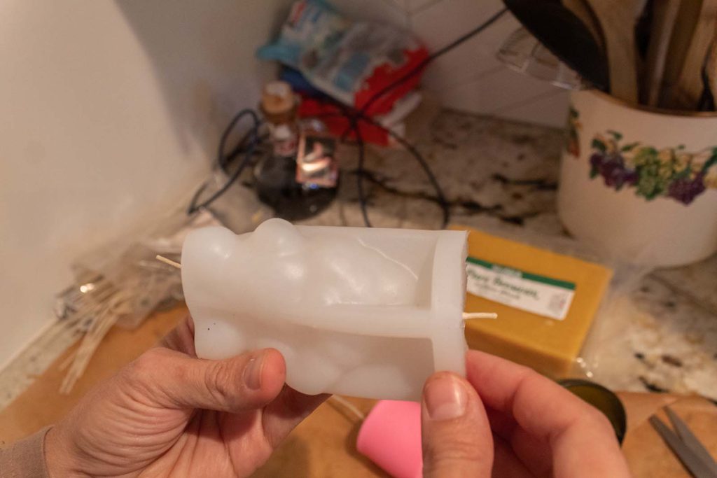 Once fully cooled down, begin releasing each candle from the mold by carefully and slowly rolling back the mold. You can use a mold release spray prior to pouring your wax if you like, but we had no issues with any wax sticking to the molds. I tried not to put too much pressure on the candle itself as I rolled back the mold.